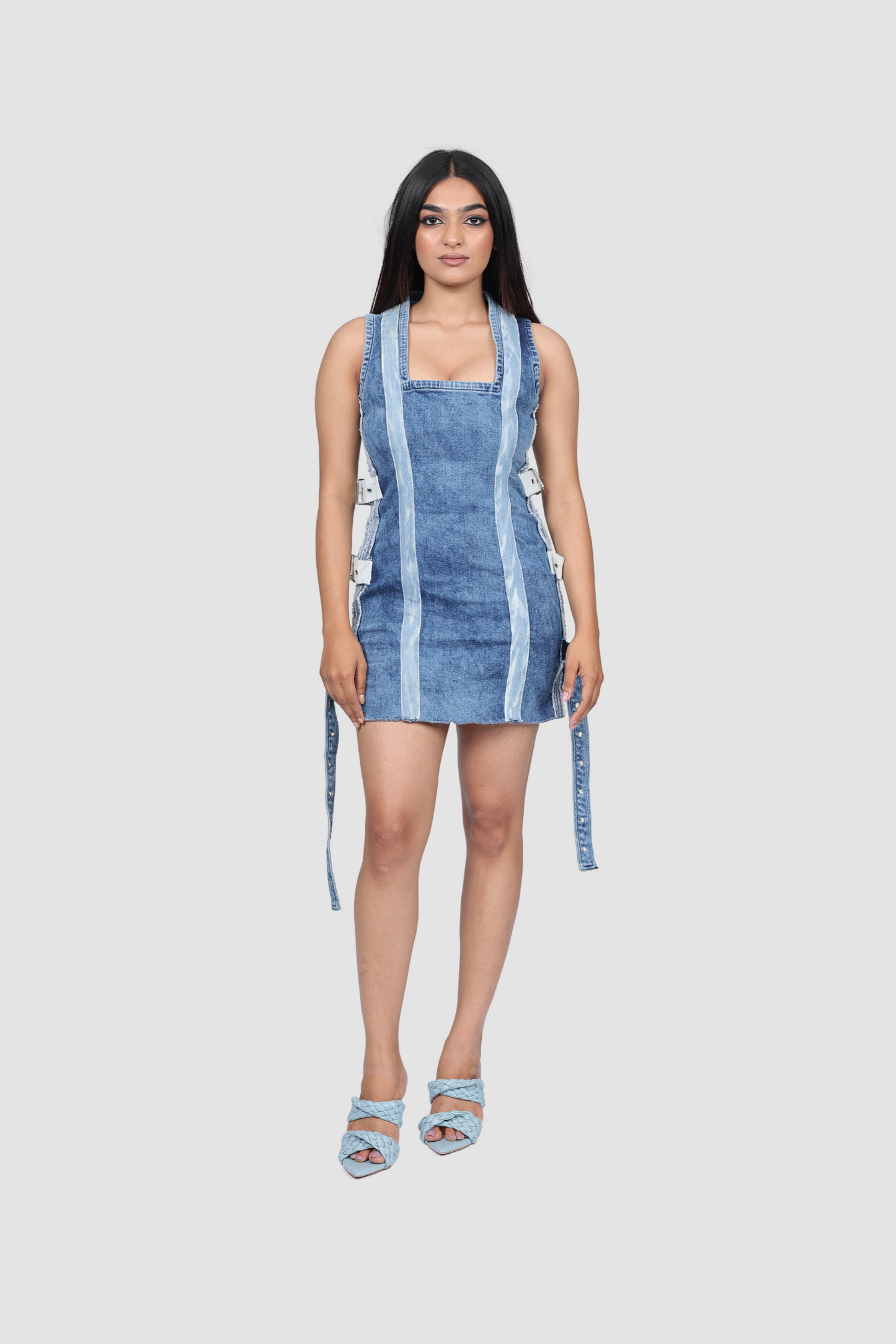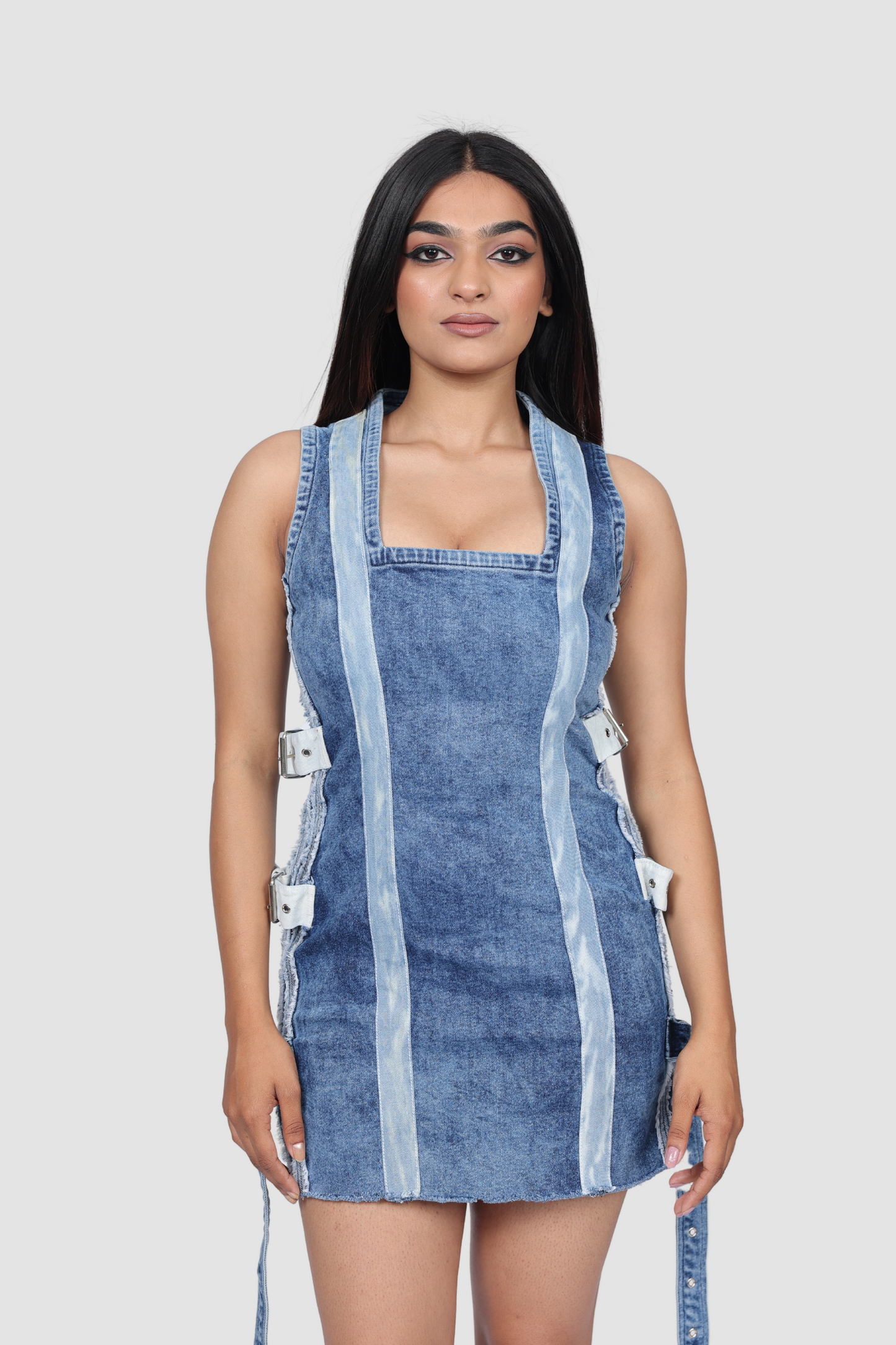 This is a shorter version of a design from our main collection. It features a towel-washed blue mini denim dress with intricate seam detailing along the sides, adorned with white and blue belts that really make it stand out! A uniquely washed denim strap enhances both the front and back, giving this dress a distinctive touch that sets it apart from the rest.