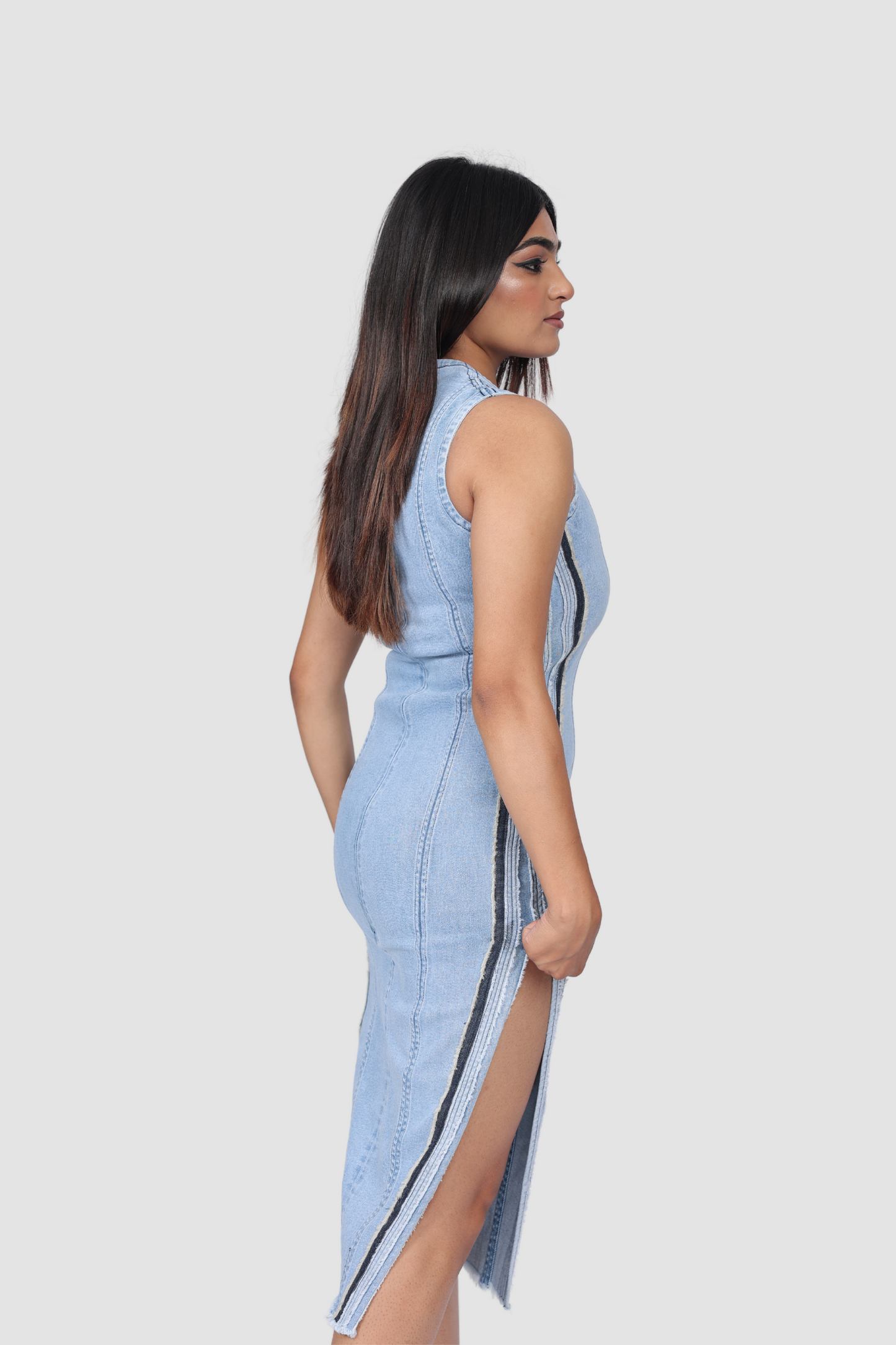 This design features a longer version of the already existing short towel-washed light blue denim dress, with a flattering neckline and intricate seam detailing along the sides. It’s adorned with dark blue selvedge strips that were purposely saved from the denim cutting process during the creation of our main collection—a part of the fabric that is usually discarded during manufacturing.