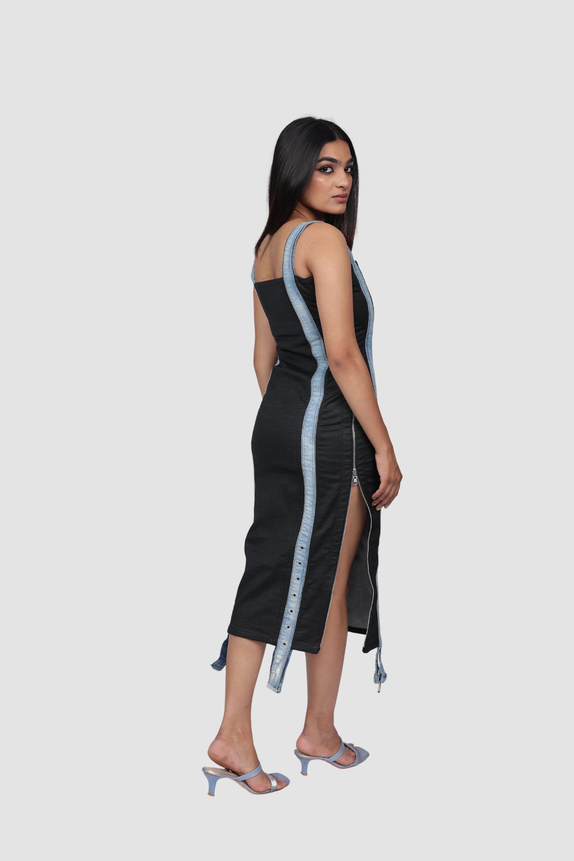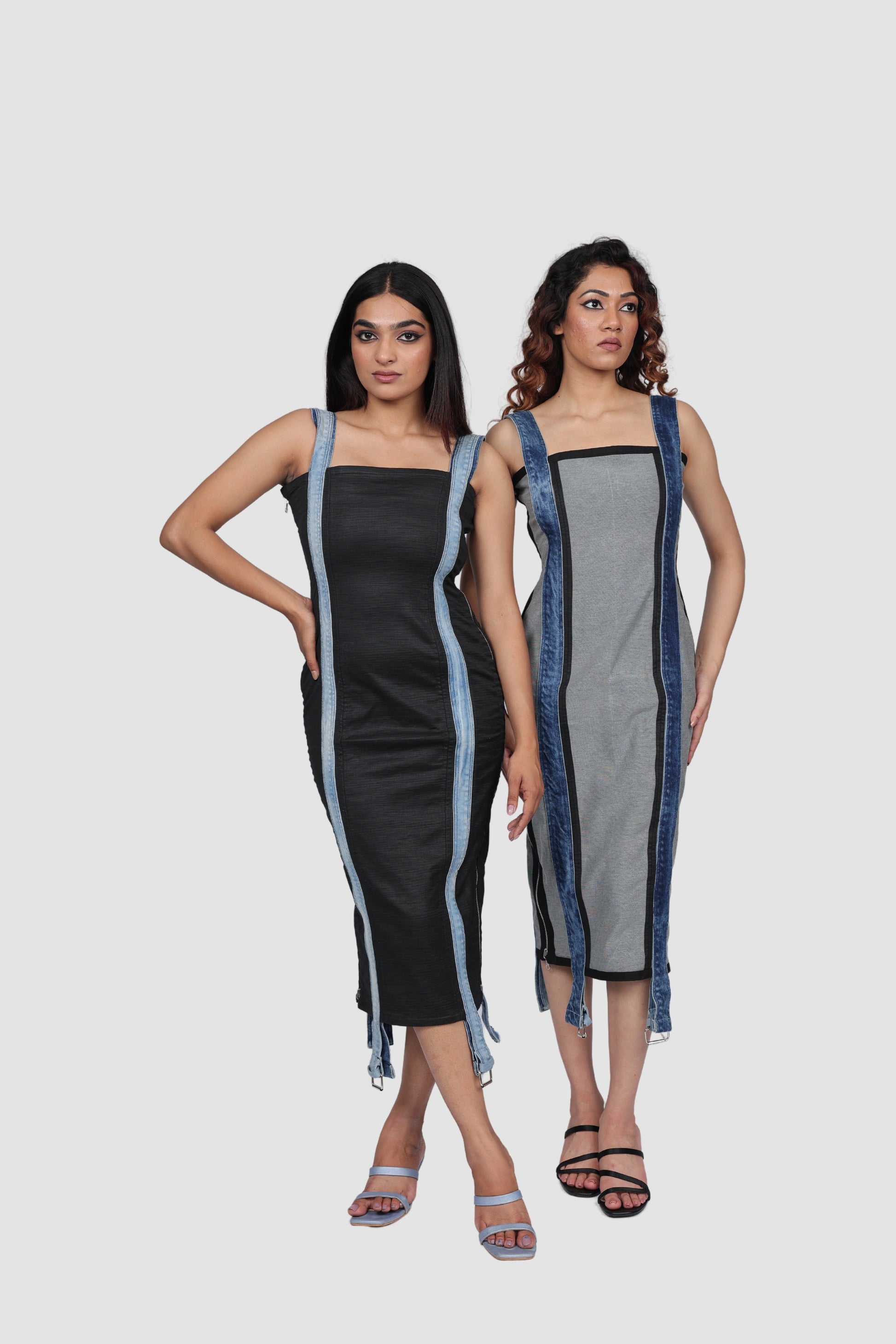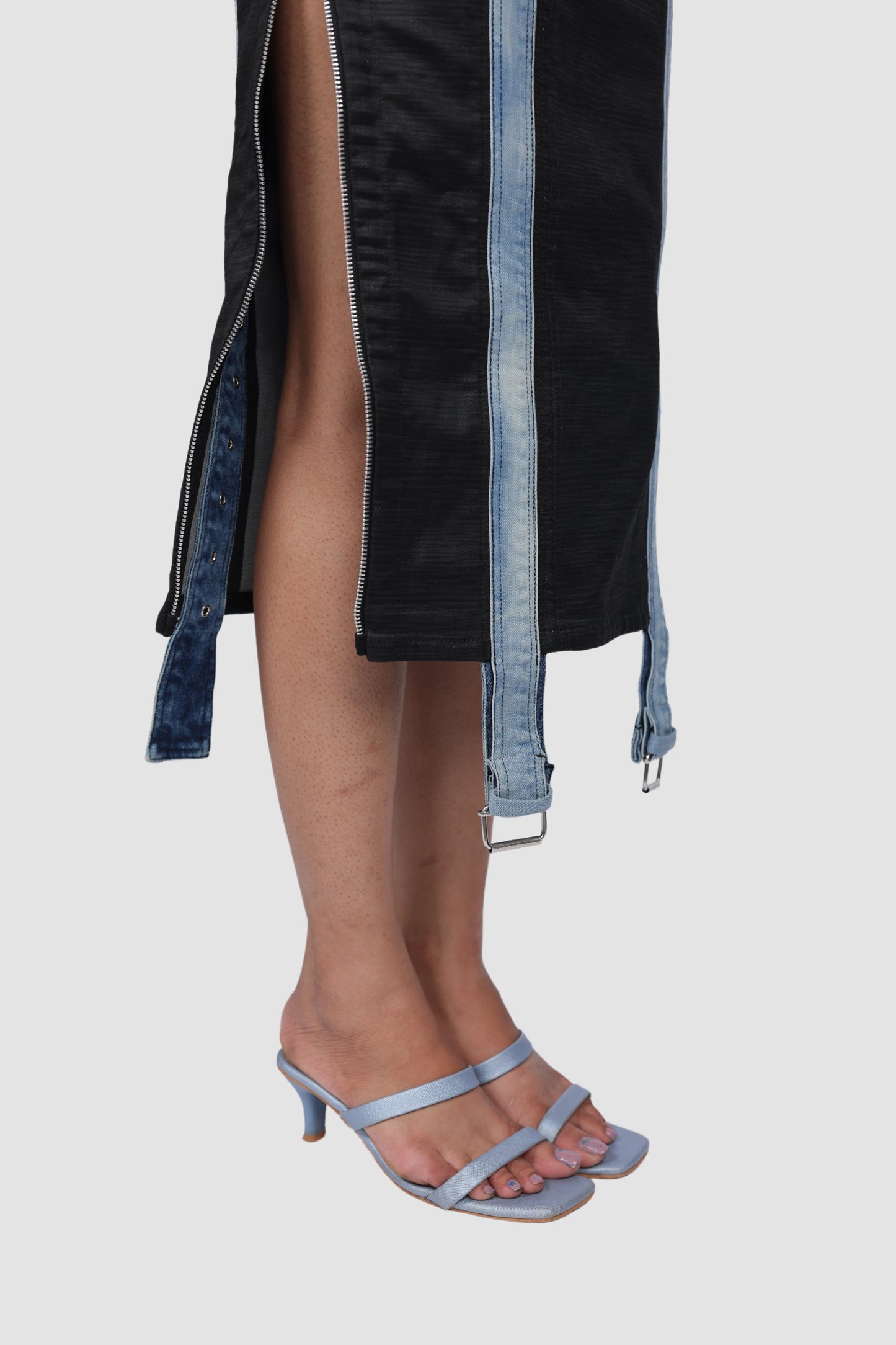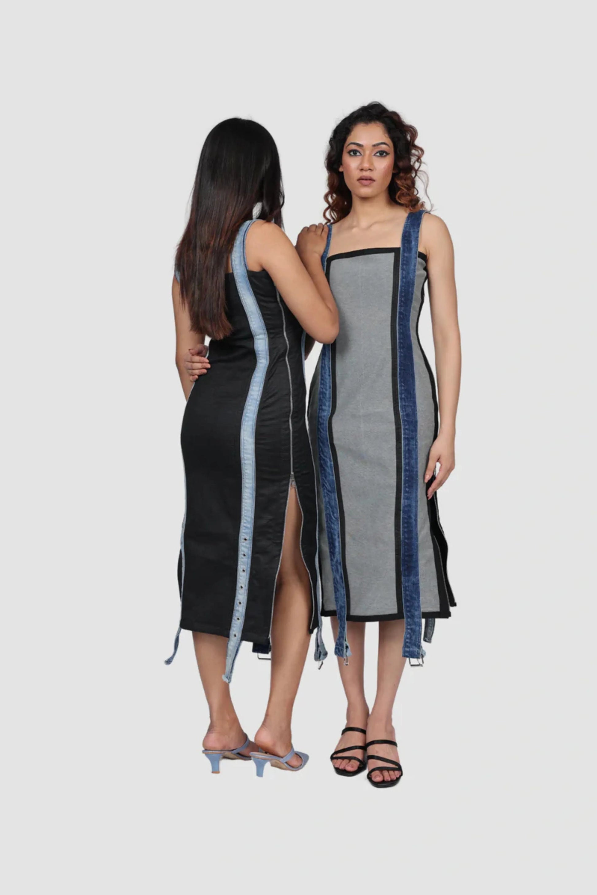 Belts, but placed in a way that acts as a top tier design element that makes the dress what it is. A belt featuring a different wash runs on the other side too, making it possible to rock this design completely reversible! The duality of colours on the reversible side gives it a whole other look than the front so really you're getting the best of both worlds. Wear the dress with the shoulder belt straps on or off and make sure to flaunt those legs by opening up the zippers to your desired length on both sides!